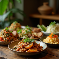 come with galangal, lemongrass, kaffir leave and certain dish has coconut milk. Inform the staff if you allergic to any of the ingredients. Thank you.